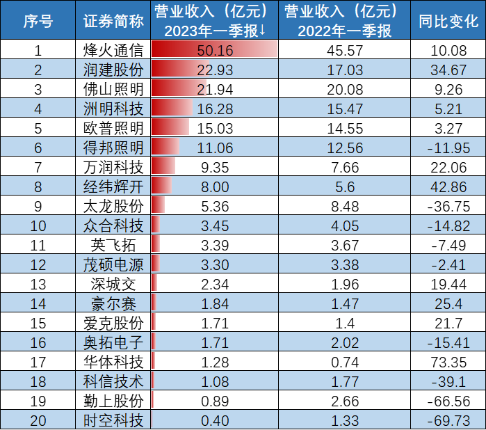 根据灯杆智慧说的统计,包括欧普照明、豪尔赛、洲明科技、时空科技、华体科技、爱克股份在内的20家涉及或包含智慧灯杆业务的上市企业均已披露2023年一季度的“成绩单”,那么今天,我们就来一起看下这20家企业2023年一季度的市场表现。
