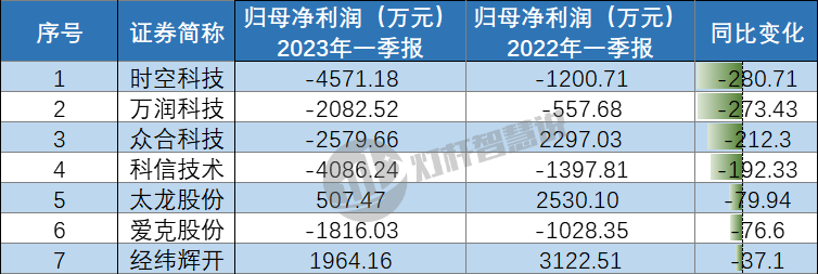 然而,几家欢喜几家愁。据财报显示,有7家企业出现了不同程度的下滑,其中有三家下滑超200%,分别是:时空科技同比变化-280.71%,万润科技下滑273.43%、众合科技下滑212.3%。