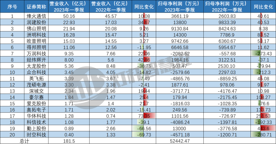数据显示,2023年一季度,20家涉及或包含智慧灯杆业务的上市企业实现营业收入合计181.5亿元,净利润合计52442.47万元。从总体来看,营收达10亿以上的企业有6家,有6家企业同比增长20%以上。