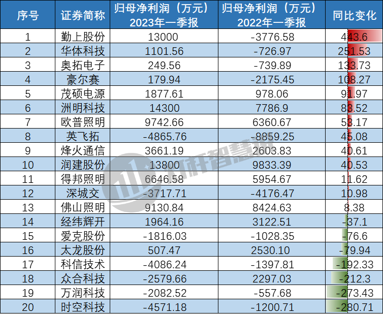 如上表,我们可以看到随着经济逐渐复苏,有13家的企业净利润同比实现增长。其中,勤上股份净利润同比增长443.6%,此外还有华体科技(+251.53%)、奥拓电子(+113.73%)、豪尔赛(+108.27%)等净利润呈较为显著正向增长。