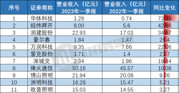 值得一提的是,华体科技虽然并未进入“营收超10亿”的队列,但其2023年一季度营收为1.28亿,而在2022年营收仅0.74亿,同比增长了73.35%,同比增长值位列第一。