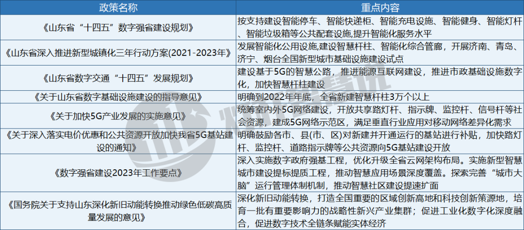 从汇总到的政策来看,山东省从数字基础设施、智慧交通、城镇化转型等方面都重点提及到了智慧灯杆。
